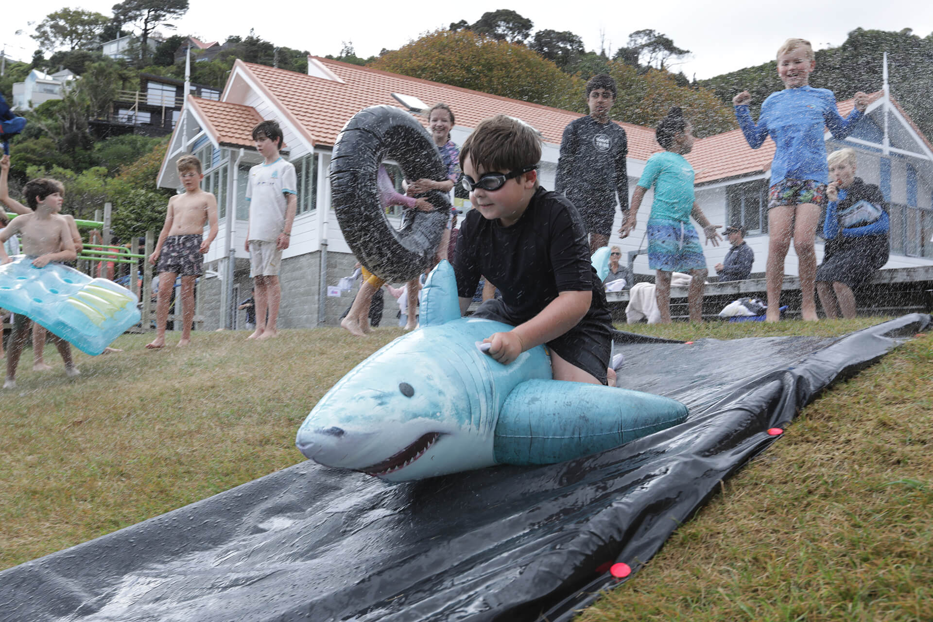 Four children in front of Days Bay House holding a ‘Welcome to Wellesley’ sign